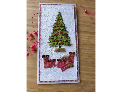 Ručně vyrobená vánoční dárková obálka s kapsou, zdobená stromkem a dárky. Stylový a originální způsob, jak věnovat peníze nebo poukaz s osobním dotekem.