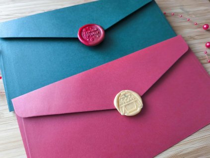 Luxusní DL obálky z metalického papíru v červené a zelené barvě, zdobené ruční voskovou pečetí s vánočním motivem. Elegantní způsob, jak darovat přání nebo poukaz.