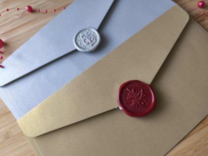 Luxusní DL obálky z metalického papíru ve zlaté a stříbrné barvě, zdobené ruční voskovou pečetí s vánočním motivem. Elegantní způsob, jak darovat přání nebo poukaz.
