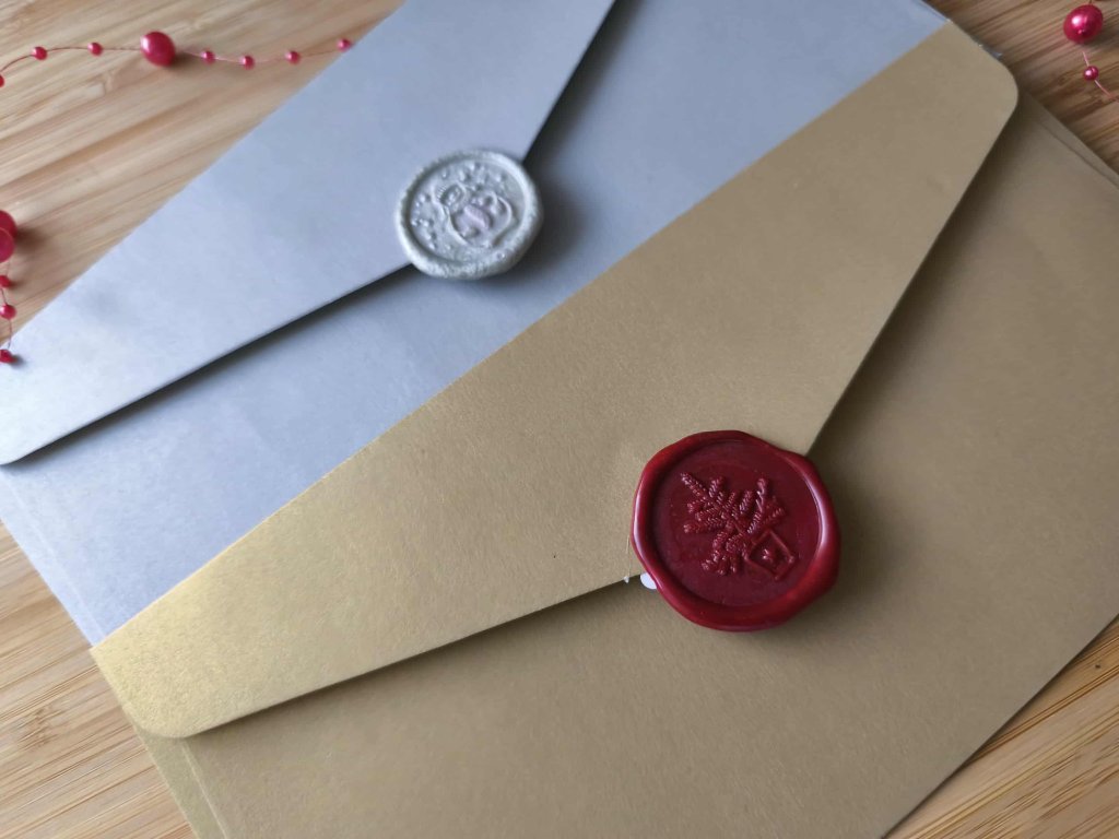 Každá obálka je ručně opatřena voskovou pečetí s jemným vánočním motivem – originální detail, který dodá vašemu dárku výjimečnost.