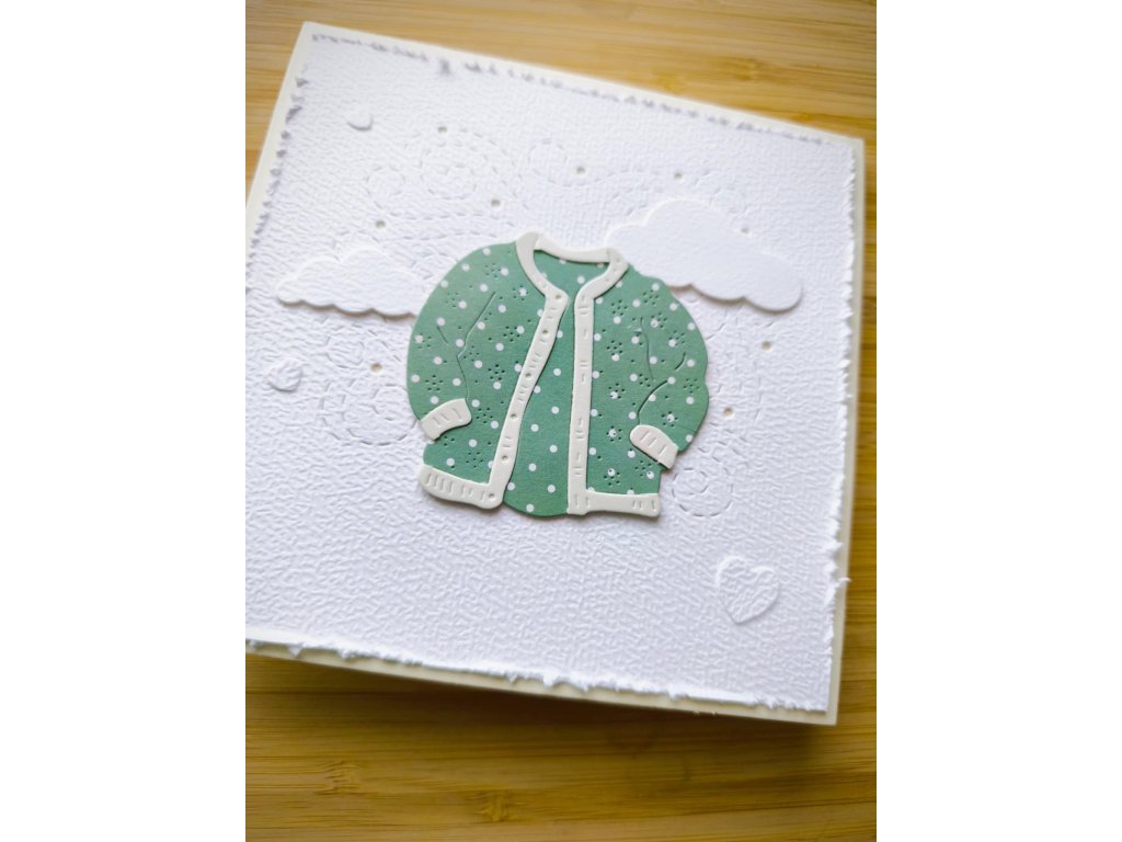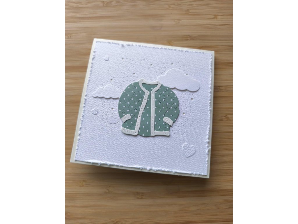 Přání zdobí papírový kabátek v zelené barvě s bílými puntíky, doplněný o plastické obláčky a srdíčko. Základ je z kvalitního strukturovaného papíru s lehce třepeným okrajem, což dodává elegantní a ruční charakter.