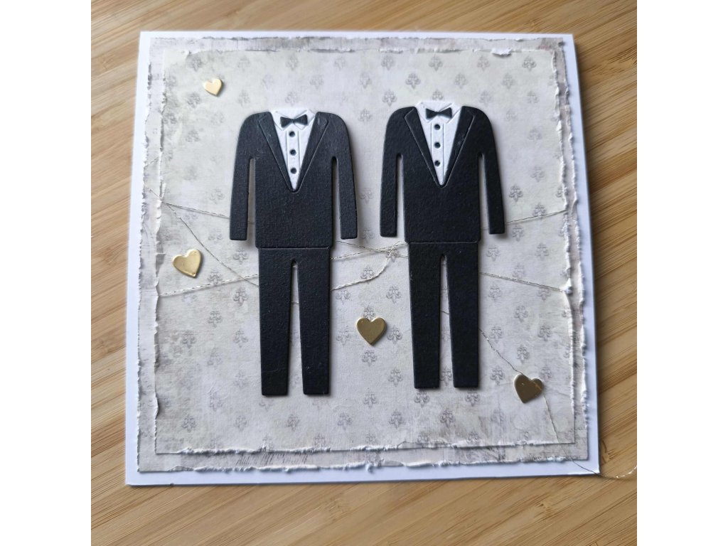 Elegantní a vkusné přání ke svatbě pro dva ženichy. Dominantou přání jsou postavy dvou mužů v černých oblecích s motýlky, doplněné decentními zlatými srdíčky a květinovým podkladem s romantickým nádechem. Strukturovaný papír a ručně třepené okraje přidávají přání originalitu a osobitý styl.