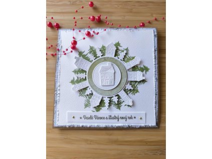 Ručně vyrobené vánoční přání s motivem zimního městečka ve vločce. Elegantní kombinace bílé, zelené a zlaté barvy dodává přání slavnostní nádech. Součástí je bílá obálka.